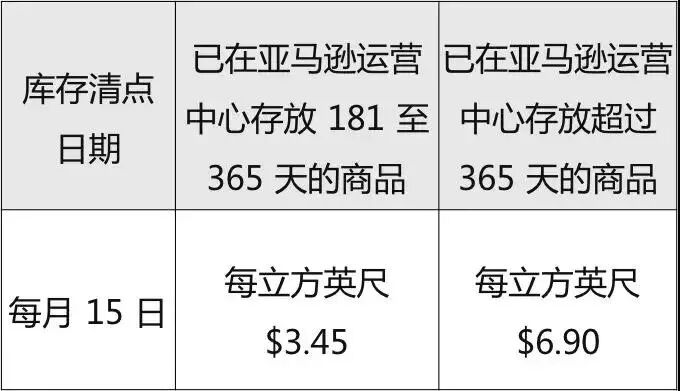 每月 15 日,F(xiàn)BA 會(huì)進(jìn)行庫(kù)存清點(diǎn)。在此日期,我們將按每立方英尺 $3.45 的標(biāo)準(zhǔn)對(duì)已在美國(guó)亞馬遜運(yùn)營(yíng)中心存放 181 至 365 天的庫(kù)存收取長(zhǎng)期倉(cāng)儲(chǔ)費(fèi)。在庫(kù)存清點(diǎn)日,我們將按每立方英尺 $6.90 的標(biāo)準(zhǔn)對(duì)已在美國(guó)亞馬遜運(yùn)營(yíng)中心存放超過(guò) 365 天的商品收取長(zhǎng)期倉(cāng)儲(chǔ)費(fèi)。