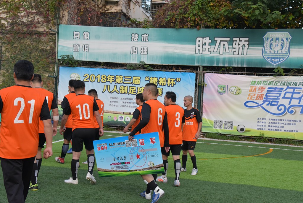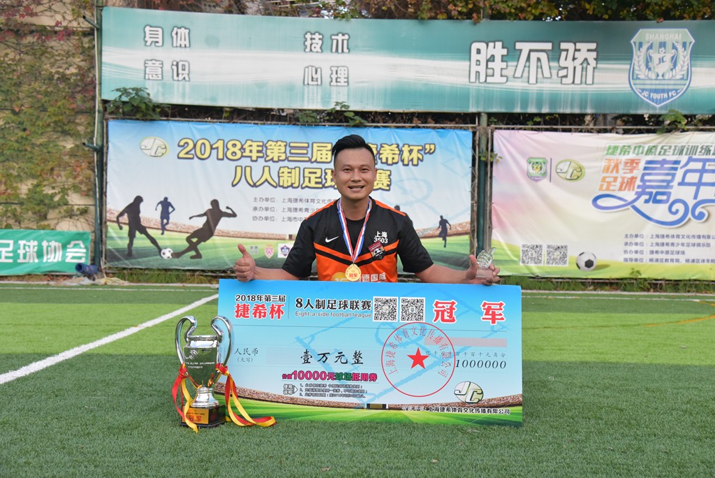 急速國際上海3603FC球隊最終以積分絕對優(yōu)勢榮獲2018第三屆“捷希杯”八人制足球聯(lián)賽冠軍,上海捷希體育文化傳播有限公司副總朱迪先生向他們頒發(fā)冠軍獎杯、獎牌以及價值10000元的捷希中原足球場抵用券。