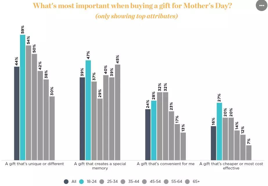 對于25歲以下的年輕消費者來說尤其如此。在為媽媽挑選最完美的禮物時,這些購物者明顯比其他年齡段的人更想要一件獨特的禮物(59%),并能創造一種特殊的記憶(47%)。