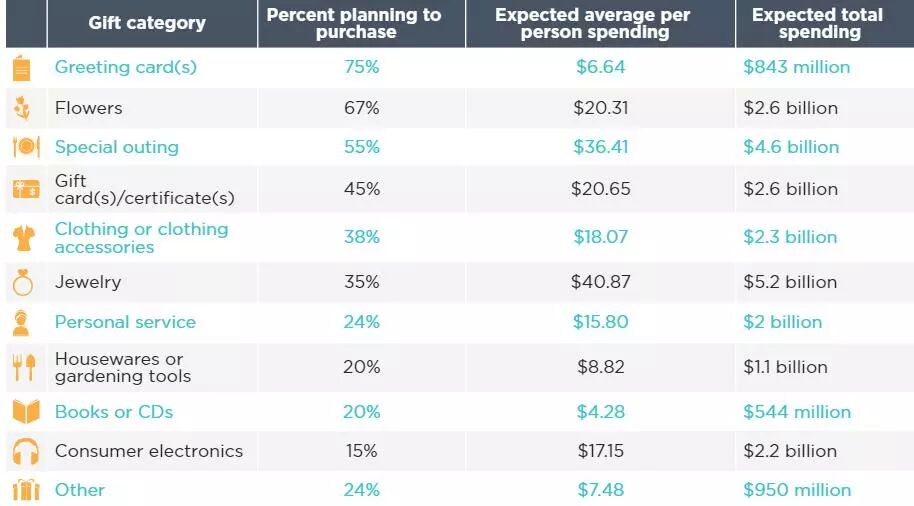 除了鮮花、賀卡和珠寶等更傳統的禮物外,包括特殊活動和禮品卡在內的送禮新模式也在不斷發展。根據調查,美國消費者計劃在母親節購買以下物品↓