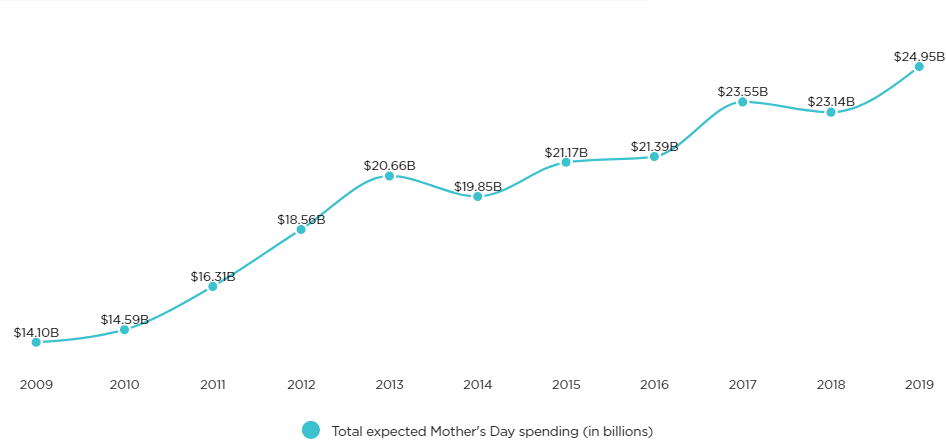 美國零售聯合會(NRF)的數據顯示,在過去十年里,美國人在母親節的花費一直在增長,今年他們的母親節花費將創歷史新高——估計達250億美元。
