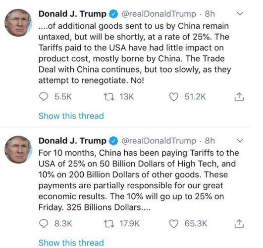 然而,昨天,特朗普在推特上連發(fā)兩文,表示中美雙方談判進(jìn)展太慢,并指中方試圖重新協(xié)商。因此,他宣布,從本月10日起(即本周五),開(kāi)始對(duì)價(jià)值約2000億美元的中國(guó)商品加征的關(guān)稅從10%調(diào)高至25%。