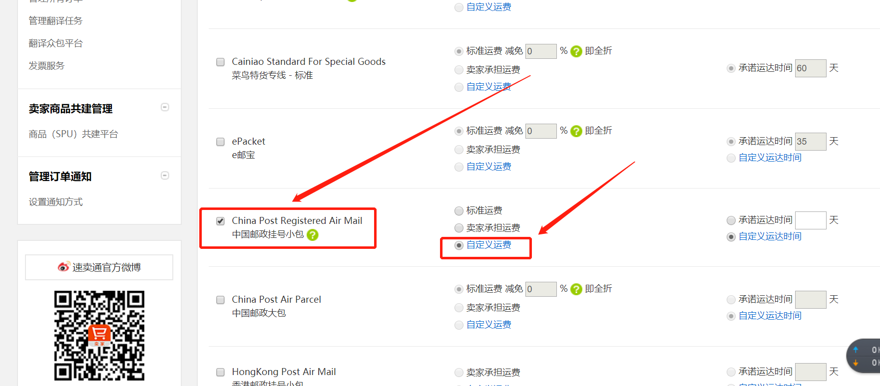 點擊展開設置,找到中國郵政掛號小包,選擇自定義運費。